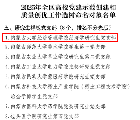 近日,中共内蒙古自治区教育工作委员会公布了2025年全区高校党建示范创建和质量创优工作选树命名对象名单,经济管理学院经济学研究生党支部入选“研究生样板支部”,标志着学院基层党组织建设取得新成效、迈上新台阶。