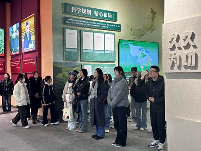 在展览馆讲解员的引导下,全体党员依次参观了“牢记嘱托 感恩奋进——办好两件大事 奋力书写中国式现代化内蒙古新篇章”和“绿色长城 生态奇迹——内蒙古防沙治沙和‘三北’工程攻坚战”两个主题展厅。通过观看图文资料和实物展示,同志们对内蒙古的发展历程、生态治理成效及未来发展方向有了更为直观和系统的认识。