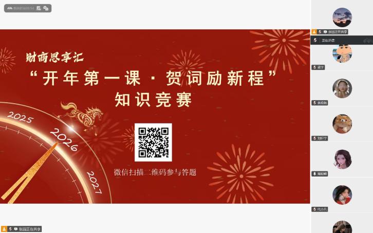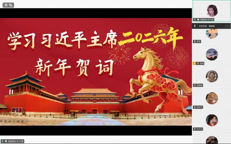 2026年1月16日下午,经济管理学院本科生二支部以“开年第一课·贺词励新程”为主题,通过腾讯会议开展线上主题党日,学习习近平主席年二〇二六年新年贺词,引导党员同志深刻感悟时代发展、明晰青年责任担当。支部书记周毅嵘主持并领学,支部全体党员参加了学习。