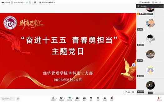 为持续深化理论学习成效,深刻领悟“十五五”规划核心要义,强化青年使命担当,2026年2月24日下午,经济管理学院本科生二支部以线上形式组织开展了2月份主题党日。本次活动以支部书记讲党课的形式开展,支部书记周毅嵘领学,支部全体党员参加。